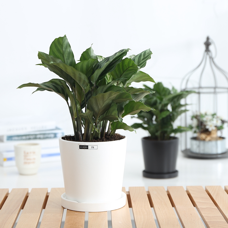 竹芋為熱帶植物,喜溫暖濕潤和光線明亮的環(huán)境,不耐寒,也不耐旱,怕烈日暴曬,若陽光直射會灼傷葉片,使葉片邊緣出現(xiàn)局部枯焦,新葉停止生長,葉色變黃,因此栽培中要注意遮光。但生長環(huán)境也不能過于蔭蔽,否則會造成植株長勢弱,某些斑葉品種葉面上的花紋減退,甚至消失,最好放在光線明亮又無直射陽光處養(yǎng)護(hù)。竹芋對水分反應(yīng)較為敏感,生長期應(yīng)充分澆水,以保持盆土濕潤,但土壤不宜積水,否則會導(dǎo)致根部腐爛,甚至植株死亡。由于竹芋葉片較大,水分蒸發(fā)快,因此對空氣濕度要求較高,若空氣濕度不夠,葉片會立刻卷曲,反應(yīng)十分靈敏,猶其是新葉生長期,更應(yīng)經(jīng)常向植株噴水,否則會因空氣干燥導(dǎo)致新葉難以舒展、葉緣枯焦發(fā)黃、葉小無光澤,天鵝絨竹芋等品種的葉片無絨質(zhì)感,嚴(yán)重影響觀賞,因此室內(nèi)栽培空氣濕度必須保持在70%至80%。冬季溫度低于15℃時植株停止生長,若長時間低于13℃葉片就會受到凍害,因此越冬溫度最好不低于13℃,并多接受光照,停止施肥,適當(dāng)減少澆水,保持盆土不干燥即可,等春季長出新葉后再恢復(fù)正常管理